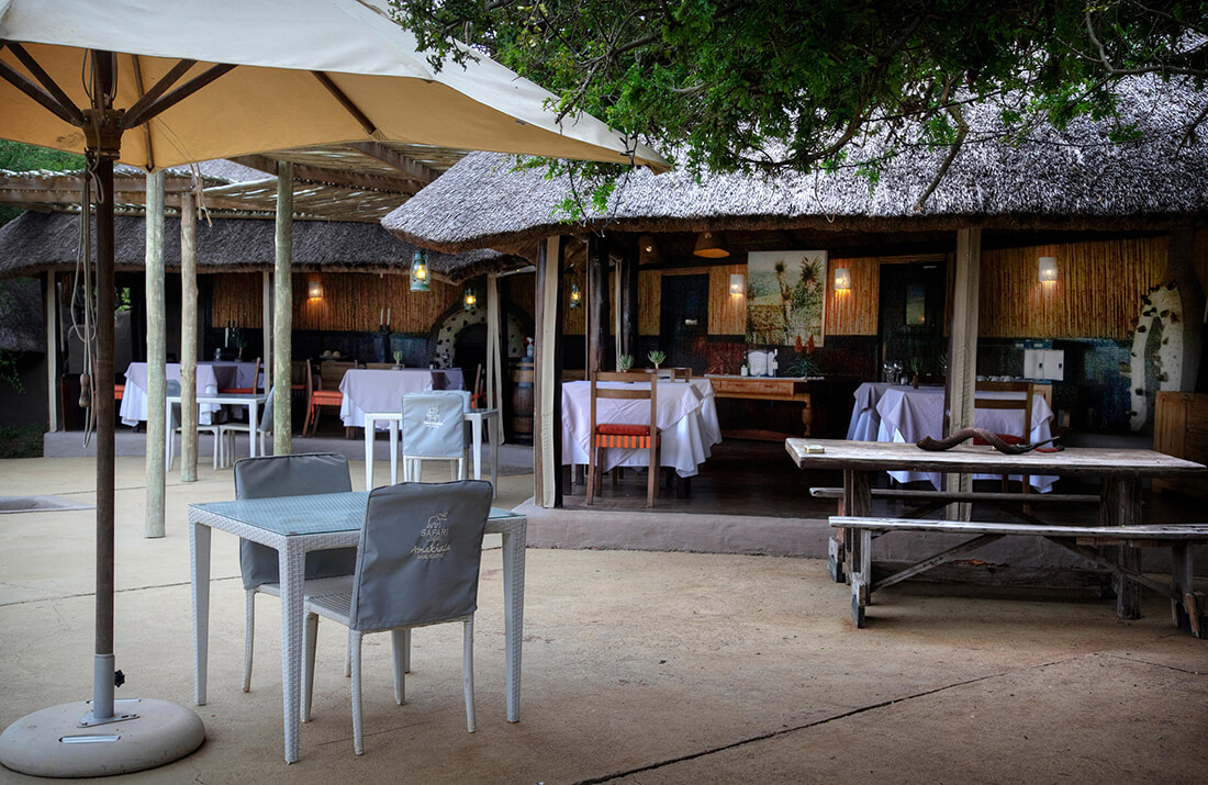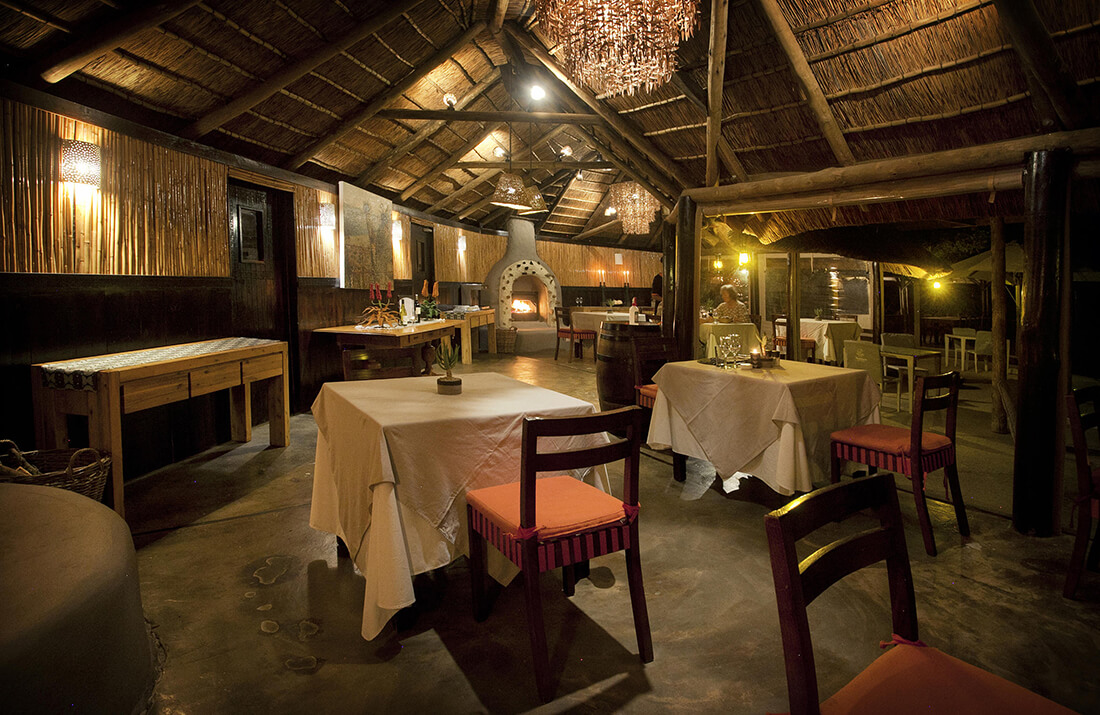 - The main lodge captures an authentic safari vibe with light tones, wooden interiors, and thatched roofs.