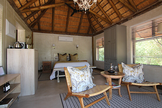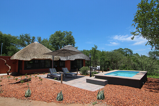 After a day exploring lion, leopard, elephant, Cape buffalo, giraffe, zebra, and a great variety of antelope, retreat to the luxurious four-star Mohlabetsi Safari Lodge with its shaded manicured lawns, swimming pool, hammock garden, and deck with magnificent views over a waterhole. With only 8 intimately luxurious accommodation units, and a total of 20 beds, guests at Mohlabetsi Safari Lodge can truly soak in the serenity of the African bush. The Rondawels with thick walls and thatch roofs ensure that the interiors are delightfully cool in the summer and stay cozy in the winter months. Guests at Mohlabetsi Safari Lodge can expect personal attention and world-class hospitality in this oasis of relaxation.