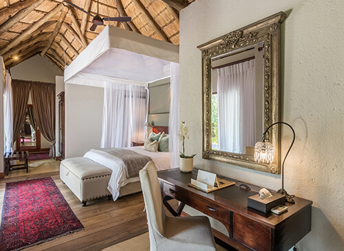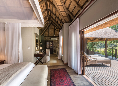 Six luxury thatch suites scattered along the riverbed have plunge pools, fireplaces, and private viewing decks making game viewing possible without even having to leave your suite. Units are elegantly furnished with draped mosquito netting, an en-suite bathroom Read morewith double vanity, a free-standing bath, and an outdoor shower for a truly unique African bathing experience. Units also include fans, air-conditioning, coffee facilities, and a mini-bar. Less
