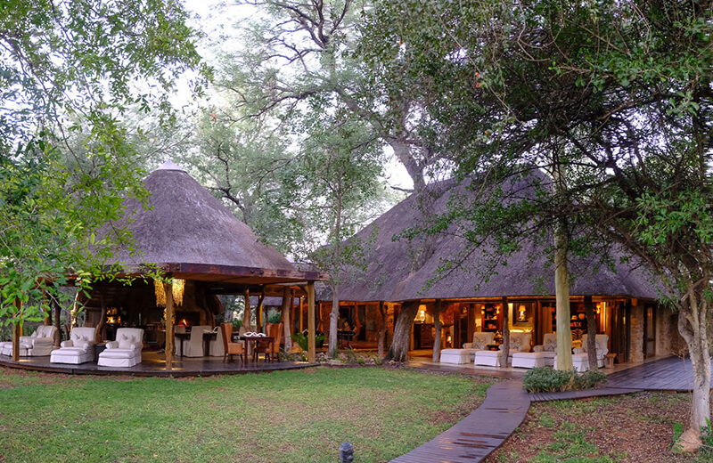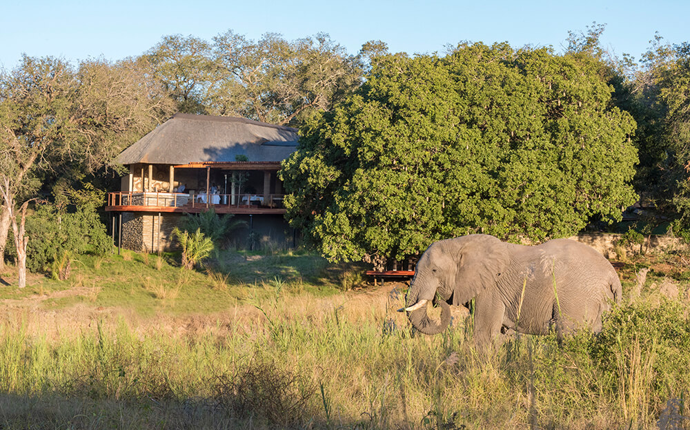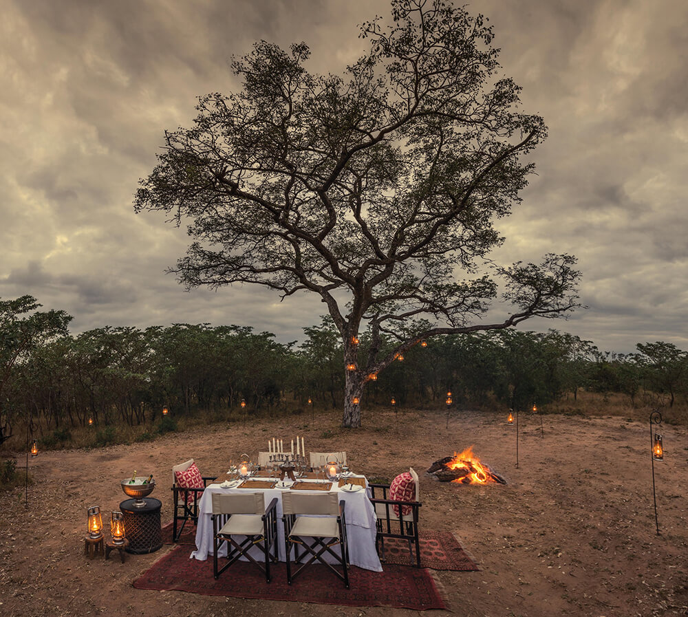 - Breakfast and lunch are served under Ebony and Leadwood trees with river views, and Boma dinners beneath the stars