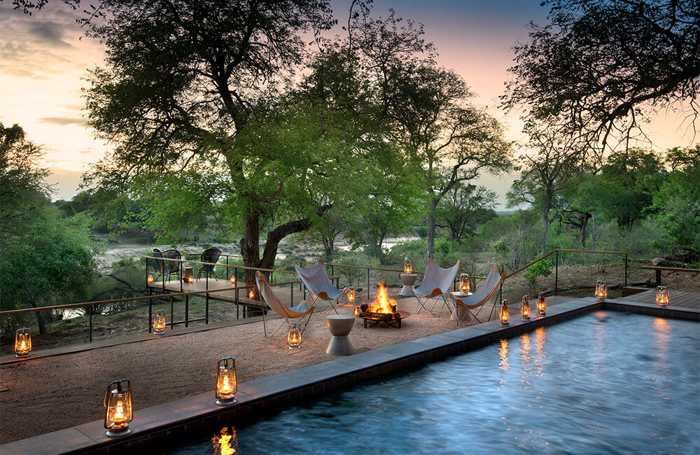 Tinga Lodge provides a classic safari experience with nine luxury suites set on a high bank overlooking the Sabie River. Each suite includes a private plunge pool and deck. The lodge features a main area with a bar lounge, library, guest pool, and boma. Tinga Lodge offers the Mack & Madi Kids’ Adventure program, with activities and a dedicated playroom for children. Families can enjoy scavenger hunts, baking, and sundowner milkshakes or hot chocolate.