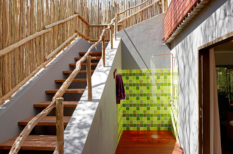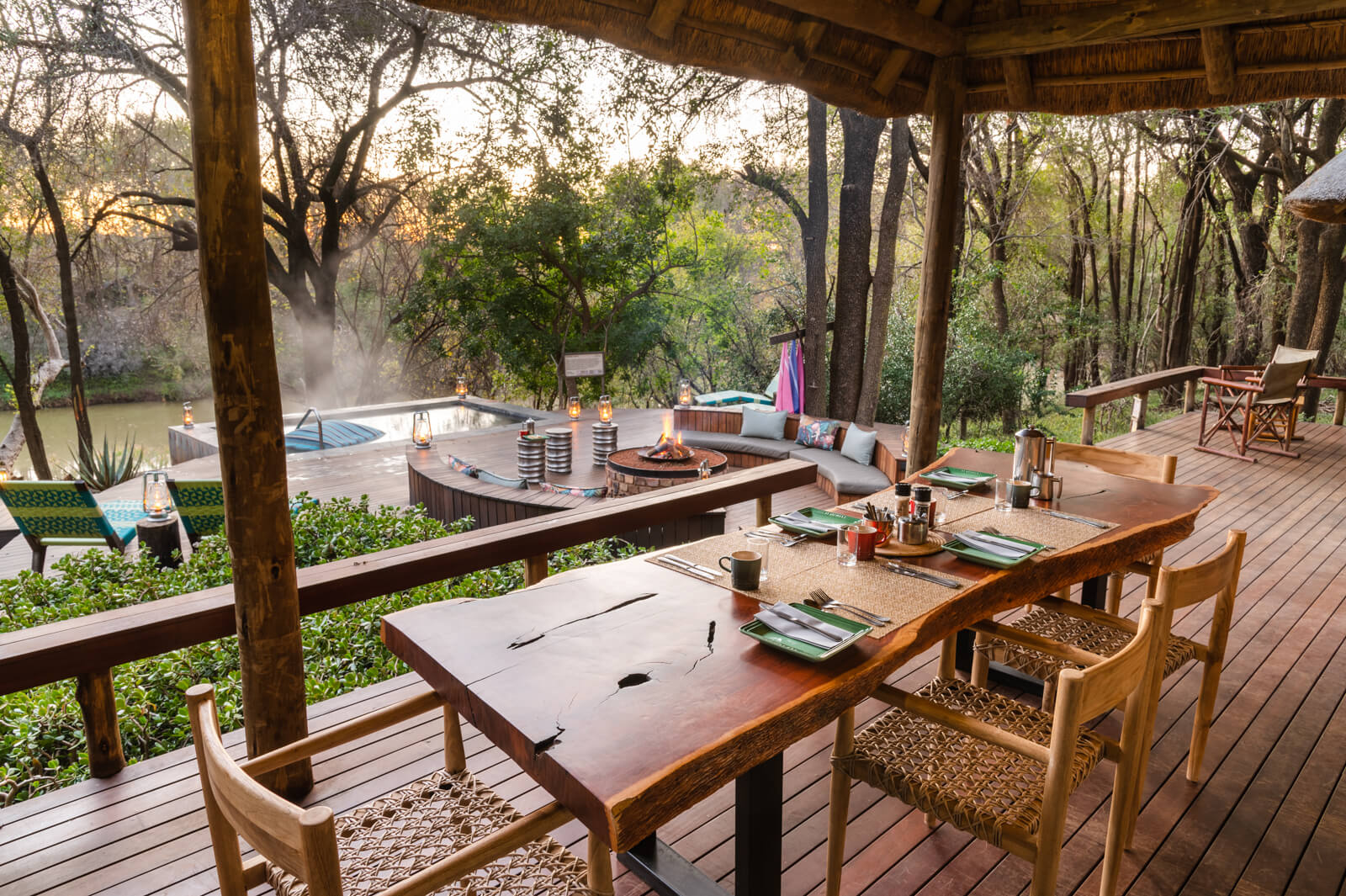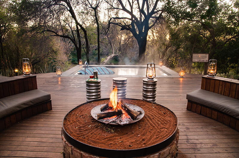 The main lodge area features a spacious, open-plan lounge and dining area with a copper fireplace and bar. The space reflects the trademark integration of eco materials and colourful decor for a captivating setting. Separate shaded swimming pool areas are perfect for cooling down in the summer heat while evenings can be spent stargazing and dining under the Milky Way.