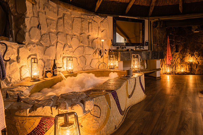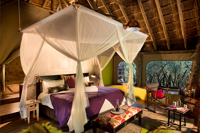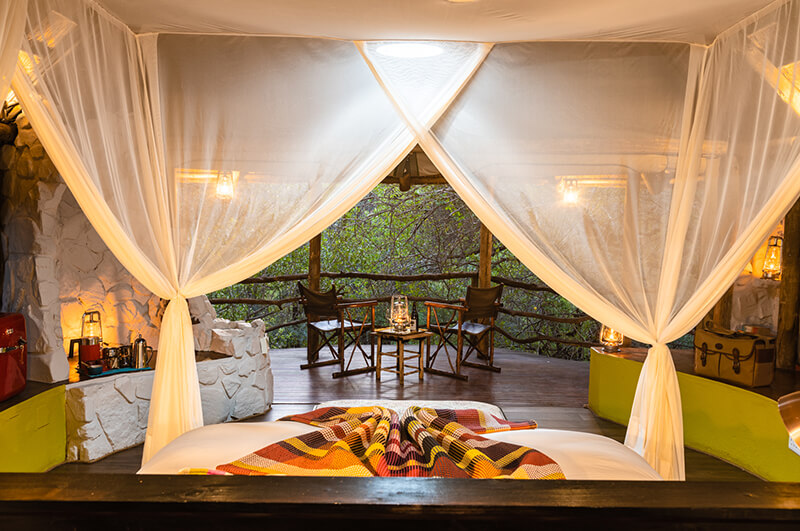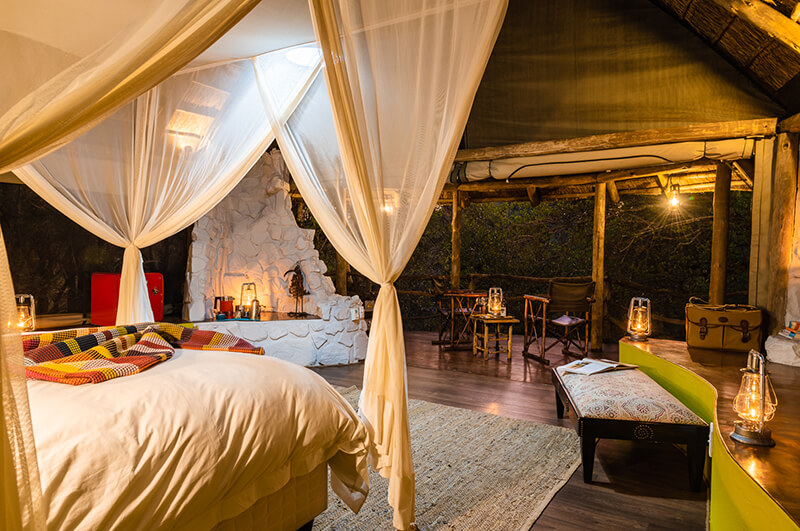 The safari-style tented suites are designed with rustic natural materials, thatched roofs, and stone walls. This is combined with canvas roll-up panels for an enchanting indoor-outdoor experience. Read moreEnjoy private alfresco showers, viewing decks, and beds elegantly draped with mosquito netting. Less