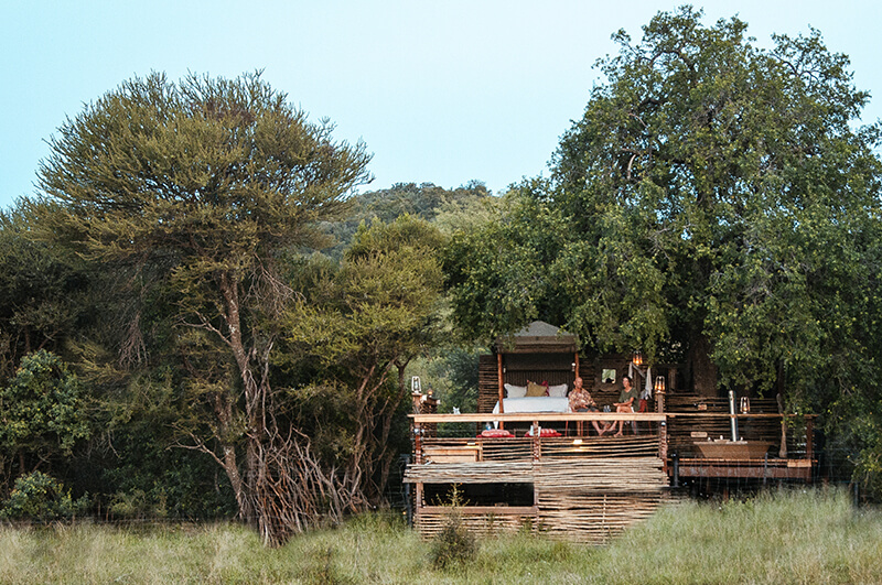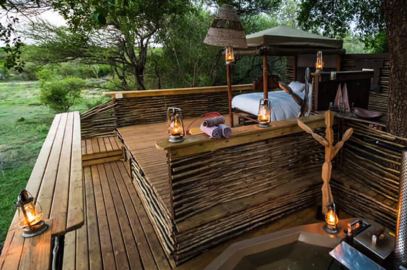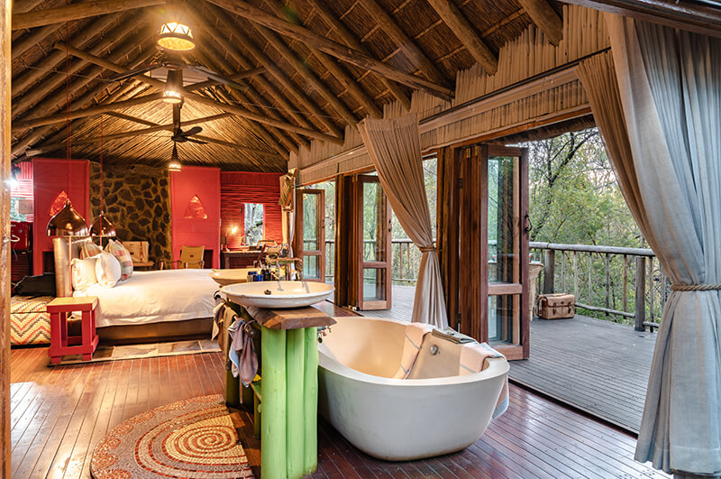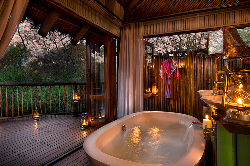 Guests at Jaci’s Tree Lodge have the opportunity to book a night at the exclusive Naledi Treehouse where you can sleep out under the stars. This unit boasts an exceptional view over a watering hole, a canopied king bed, outdoor shower, and private wood-fired hot tub. Enjoy a night of star gazing and wake up to animals gathering for a drink down below.
