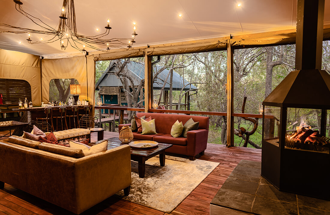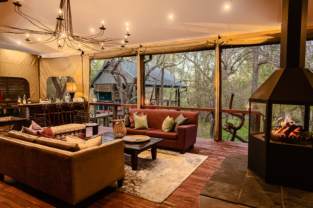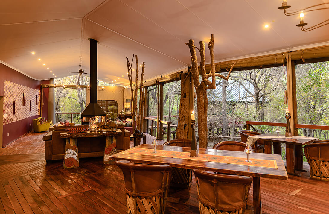 The main lodge area at Jaci’s Tree Lodge features an open fireplace separating the lounge and dining area. Here you can also enjoy a drink from the bar, relax on the raised deck, or follow a path to the lodge’s forest swimming pool for a refreshing dip.
