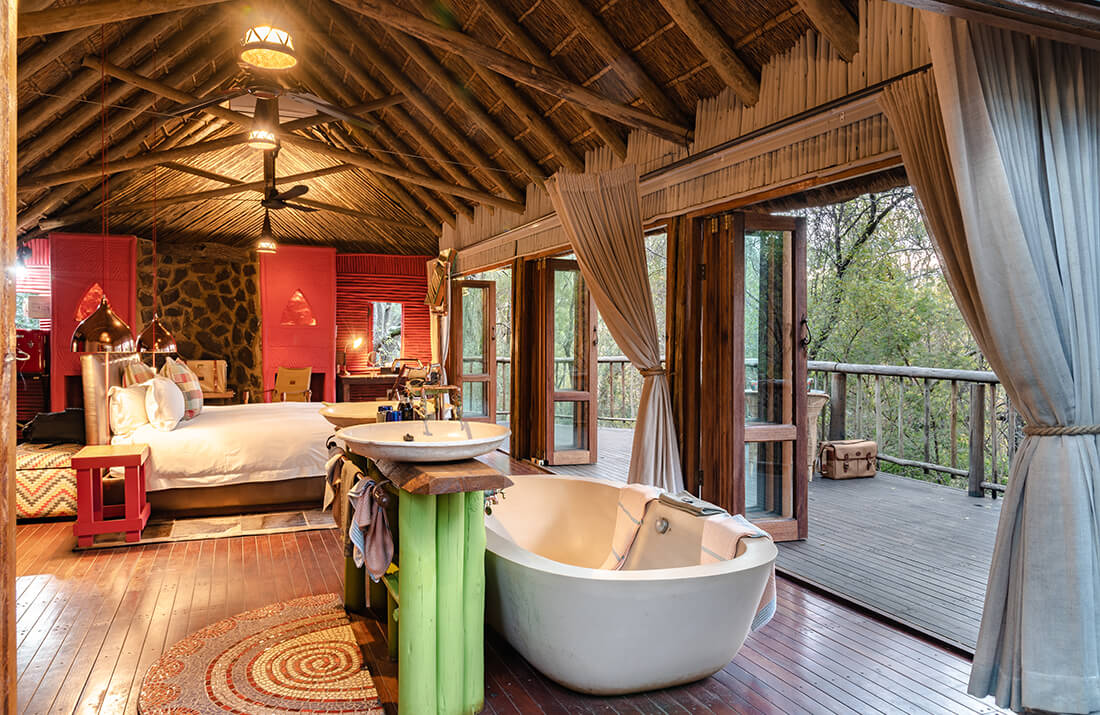 The treehouse suites are raised in treetops and designed with rustic natural materials and thatched roofs. This is combined with large stacking doors for an enchanting indoor-outdoor living experience. Read moreEnjoy an alfresco shower, indoor soaking tub, and private viewing deck. Less