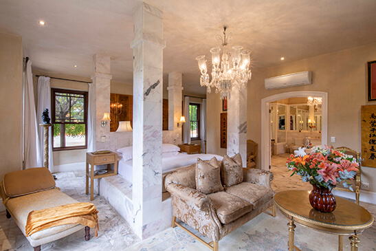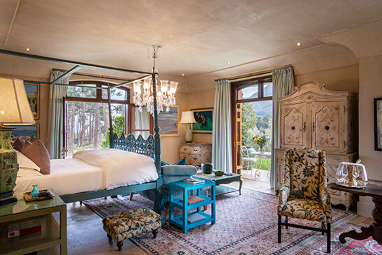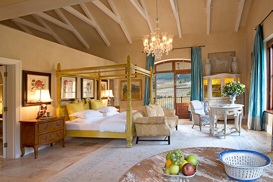 The Great Hall welcomes you with a grand chandelier, setting the scene for a lavish stay at this Franschhoek hotel. Franschhoek is renowned as the food and wine capital of the country, so you can be guaranteed that dining at La Residence will be nothing short of spectacular. The on-site restaurant has its own vegetable and herb garden from where fresh produce is hand-picked for seasonal menus. Enjoy a personalized cookery demonstration at the Chefs Table and enjoy locally produced world-class wine pairings. Dine outdoors in a delightful garden setting or cozy up next to a fire in winter for a candlelit dinner.