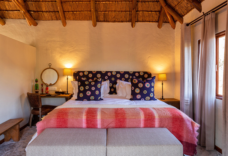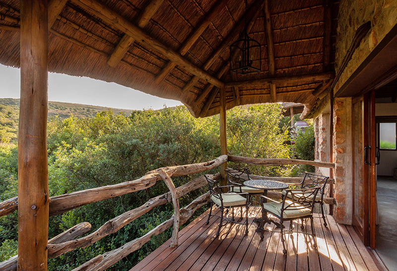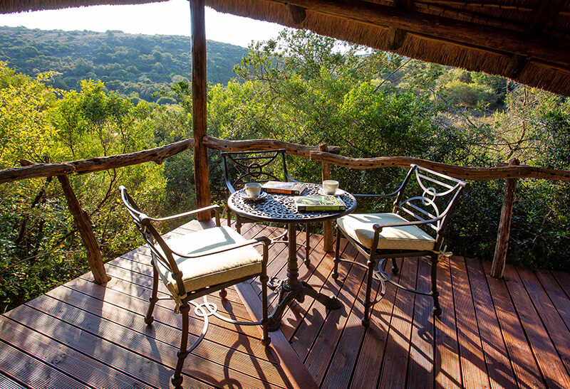 - Each stone and thatch chalet opens onto a private viewing deck that overlooks the surrounding bush.