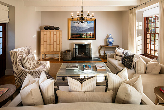 The luxurious suites at Leeu Estate are individually styled in an effortless blend of contemporary and traditional designs with a neutral color palette complimenting the tranquil natural surroundings. International artworks and sculptures are showcased throughout the estate. The main property caters to hotel guests only ensuring exclusive service, dining, and attention to detail.