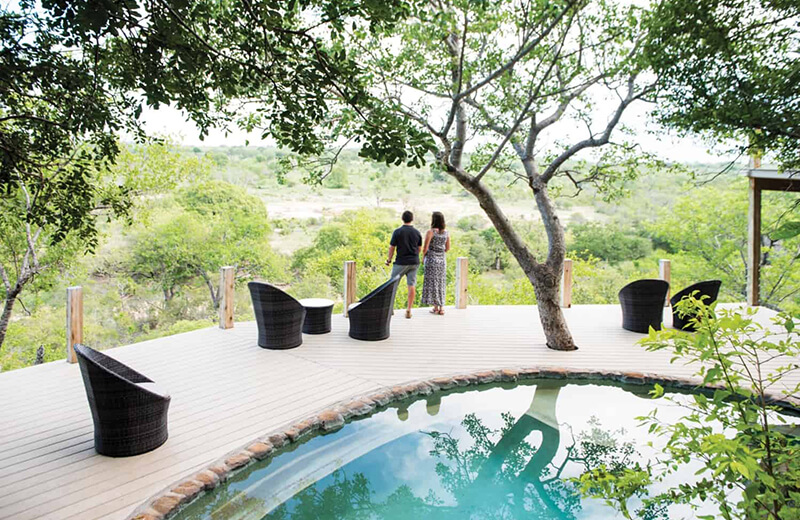 An open-air deck and main swimming pool with views of an active waterhole