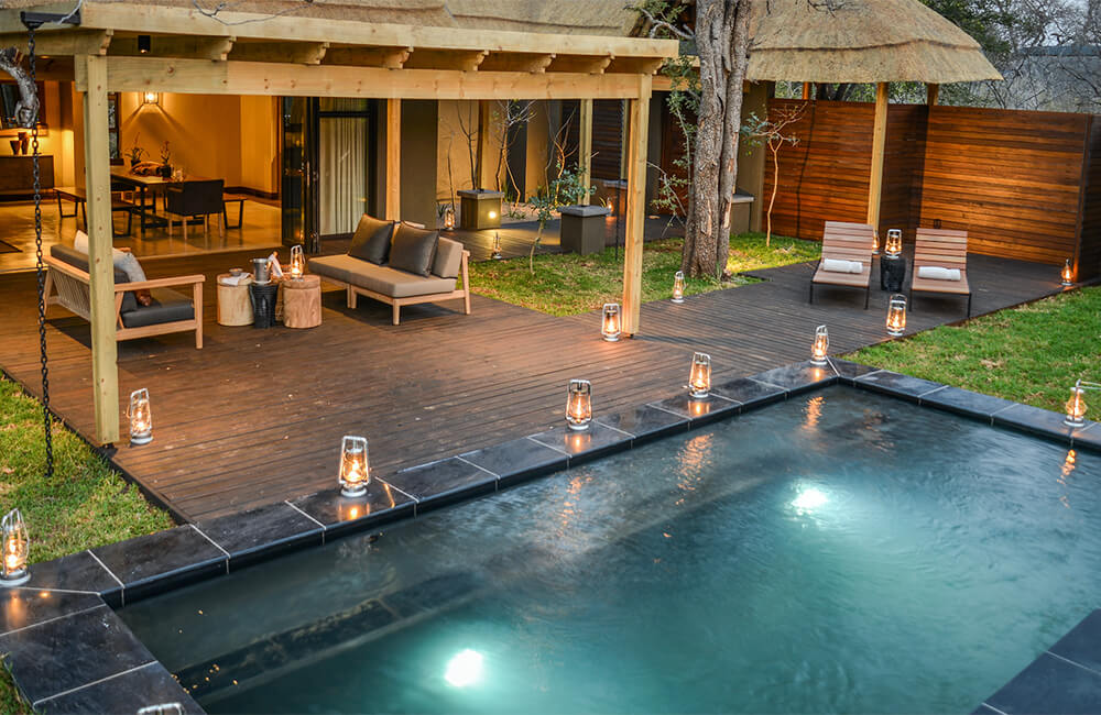 Hi’Nkweni Villa features 2 ensuite bedrooms with outdoor showers and luxurious indoor bathrooms, a gorgeous deck with a private pool, bushveld views, and fireplace for cozy evenings. Read more The spacious air-conditioned suites resemble comfort and warmth combining organic elements with contemporary decor. Less