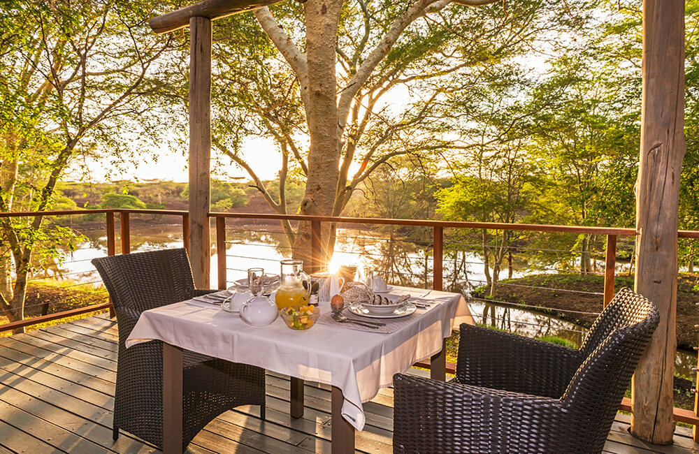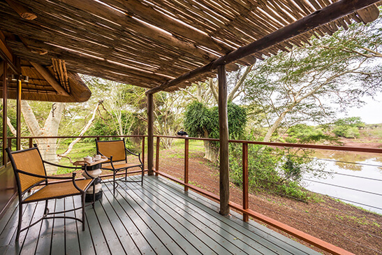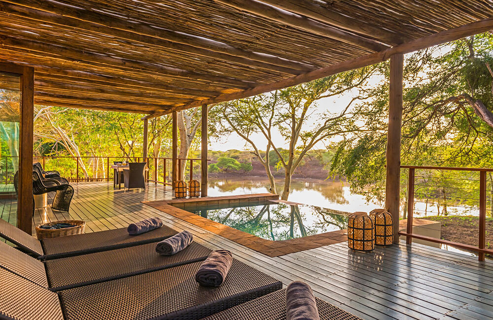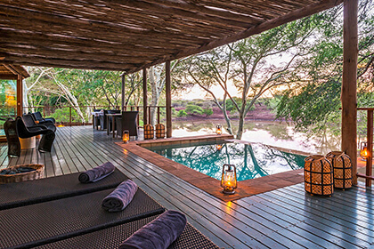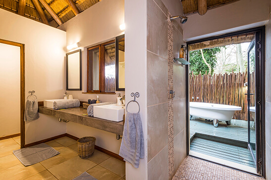Three luxurious chalets accommodate up to 6 guests, with extra beds for small children on request. Each of the en-suite units feature a private veranda with waterhole views, making for glorious game viewing from your suite. Read moreChalets also include a free-standing bath, alfresco shower, air-conditioning, fan, and safe. Less