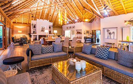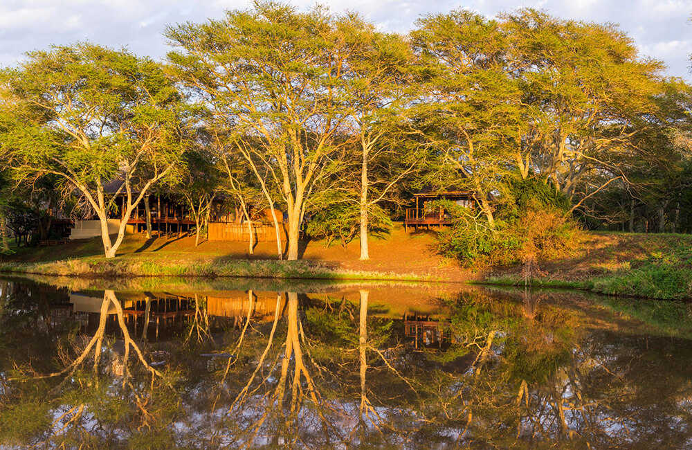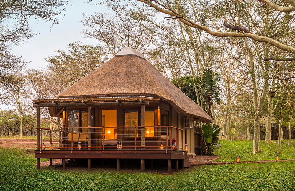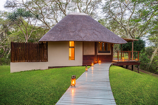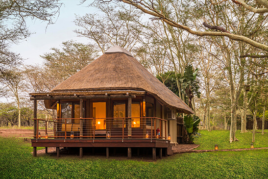 With a varied landscape of mountains, riverine woodlands, and open plains, Manyoni Private Game Reserve spans 23000 hectares of remarkable wildlife territory. Densely populated with wildlife the reserve offers an exciting Big 5 experience, whether viewing animals from the lodge deck, on a 4-wheel game drive or while relaxing in the rim-flow pool overlooking a water hole. Set within the reserve, in the heart of KwaZulu Natal, Bayete Zulu Private Camp offers a completely exclusive getaway for 6 guests in a sheltered fever tree forest. Three chalets share an open-plan main area with lounge, cozy fireplace, library, expansive garden, and dining room. Meals are all catered for by a private lodge chef and can be enjoyed outdoors in the boma under the stars.