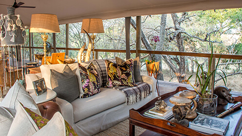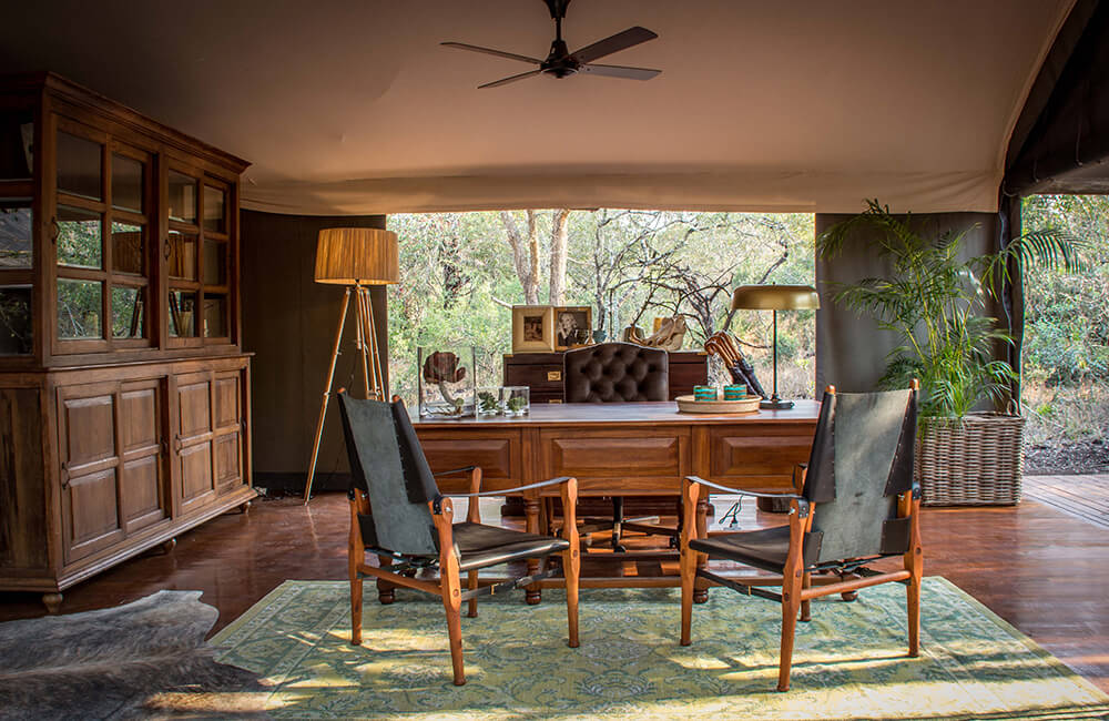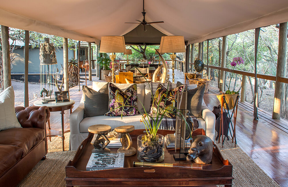 - The camp consists of canvas tents perched on wooden decks, elegantly styled in classic safari décor.