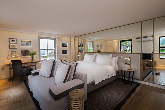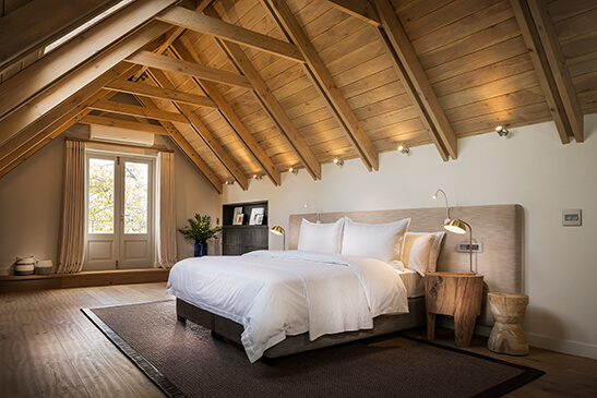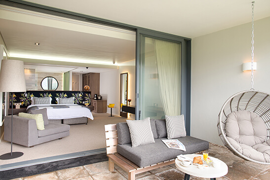 The largest and most luxurious rooms at Mont Rochelle feature a lounge, exclusive-use plunge pool, and private terrace. The en-suite bedroom with king bed opens onto the terrace. The bathroom is a haven of relaxation with soaking tub, freestanding shower, and indulgent bath amenities.