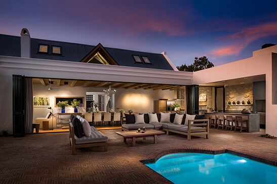 The Manor House is a four-bedroom Cape-Dutch villa featuring a contemporary interior with expansive dining areas, modern kitchen, and private chef service. Bedrooms integrate stone walls and timber beams into stylish retreats with a fireplace and terrace. The villa offers an outdoor pool, gym, and glorious Winelands views.