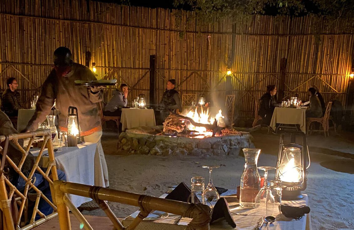 - Evenings are spent dining in the bush or in the open-air traditional African Boma under the stars.