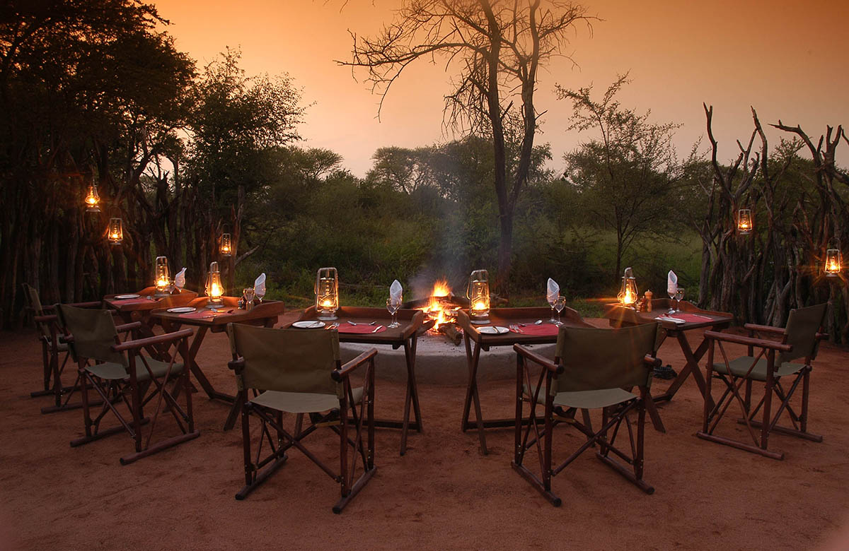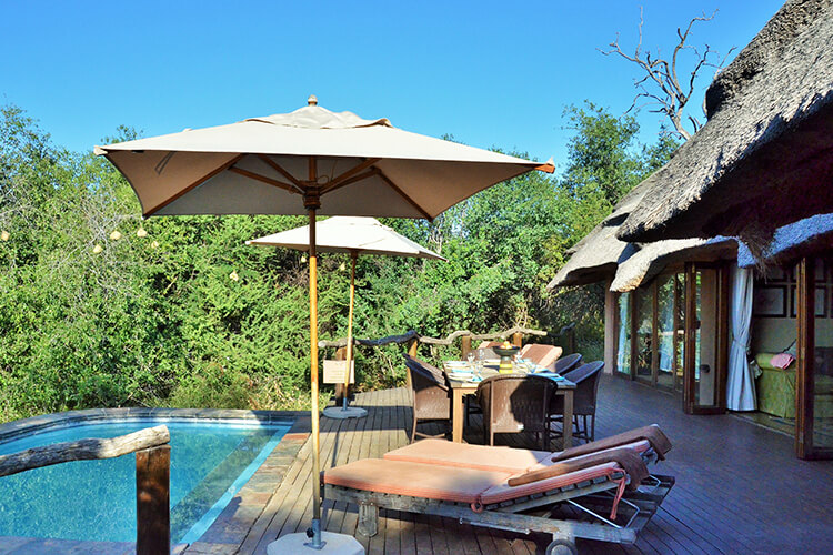 The exterior features a rim-flow pool with a view of the active waterhole and a communal viewing deck where you can sip cocktails in the shade of ancient trees. Evening meals can be savoured in the boma around a roaring fire. Here, lanterns romantically light up the outdoor dining area while starlit skies shimmer up above.