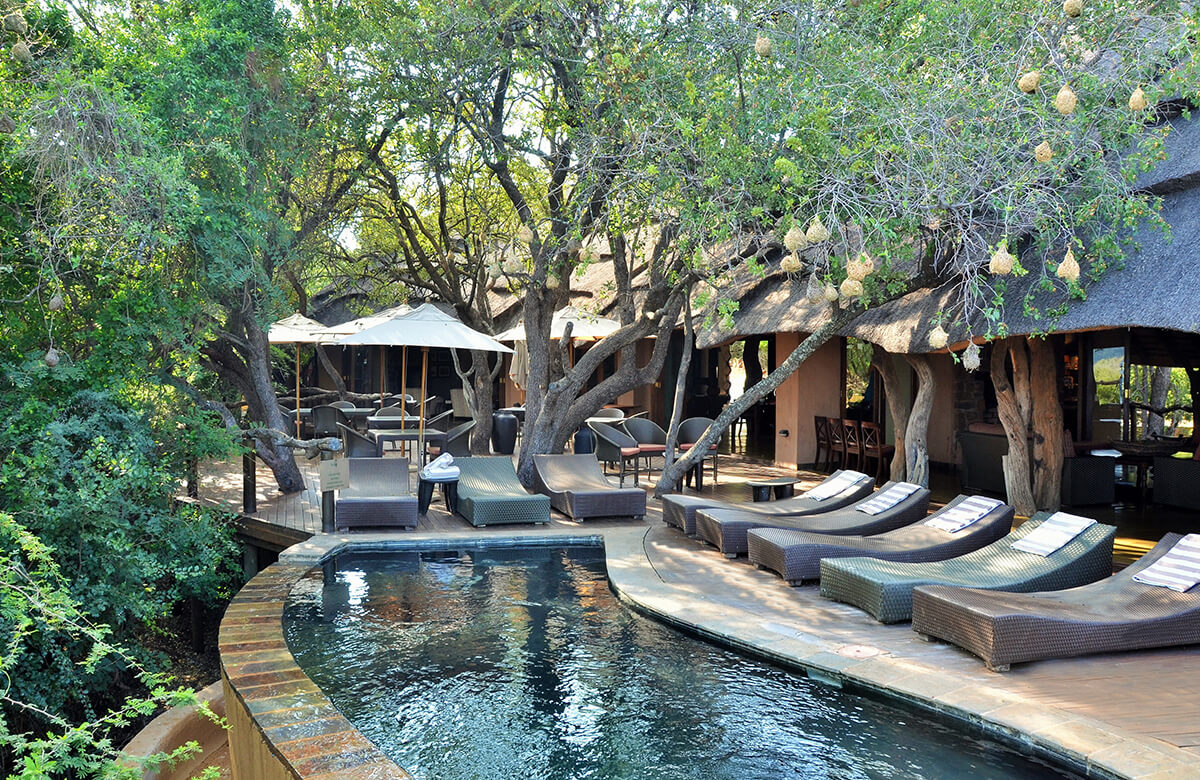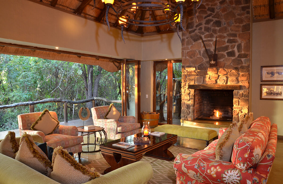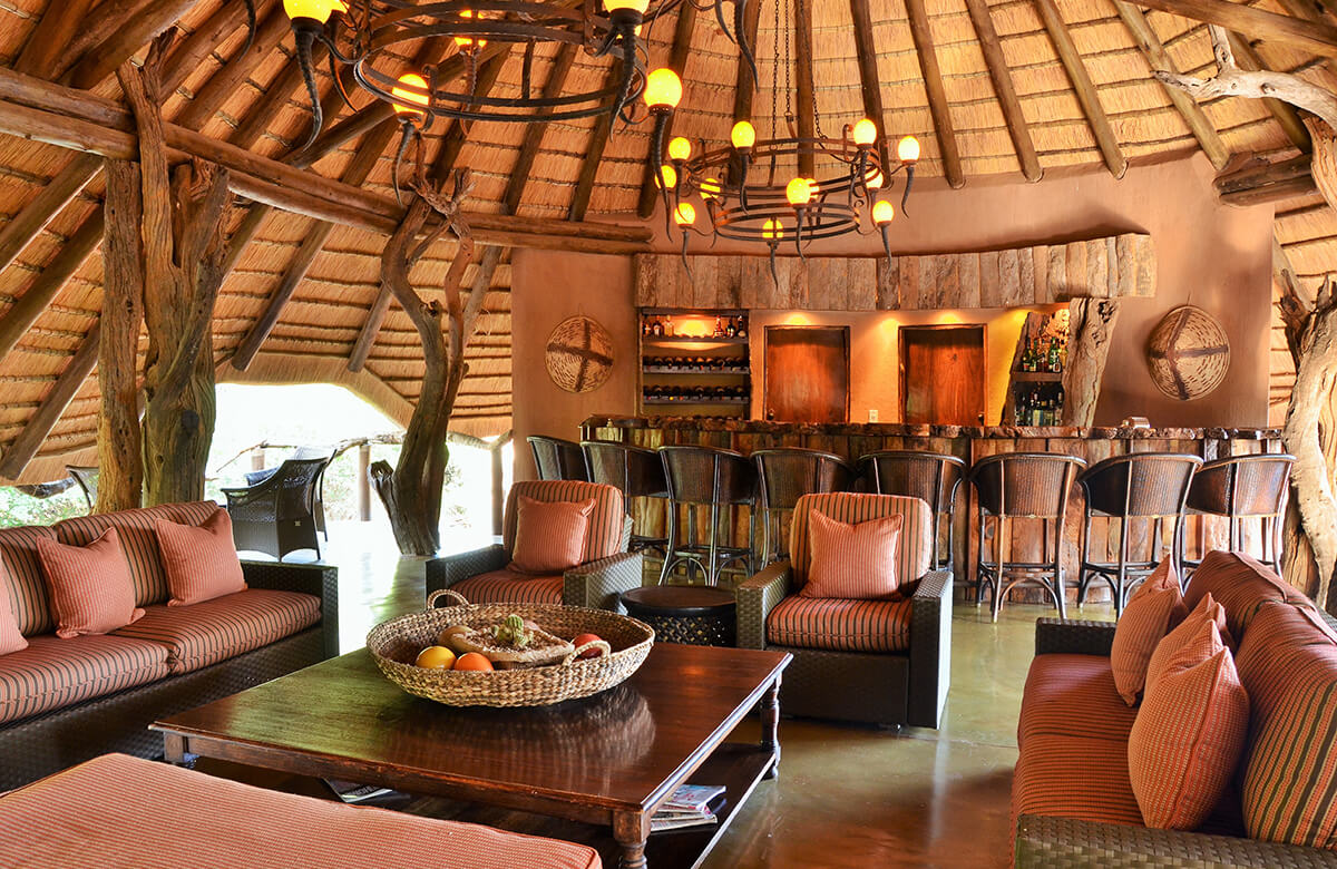 Nestled among Leadwood trees, the Motswiri Safari Lodge area comprises a separate lounge, dining room, and bar, each with its own roaring fireplace in the winter. The design is a celebration of the surrounding landscapes with high thatch ceilings and natural color palettes. The layout beautifully integrates organic elements with rustic and elegant accents.