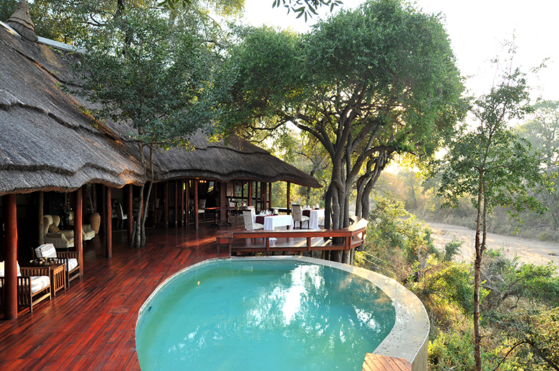 - An expansive viewing deck features a swimming pool and outdoor lounge area, shaded by a majestic Jackalberry tree.