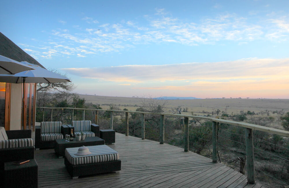 - Spacious luxury suites have private decks overlooking the expansive plains.