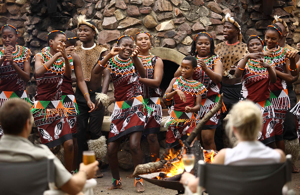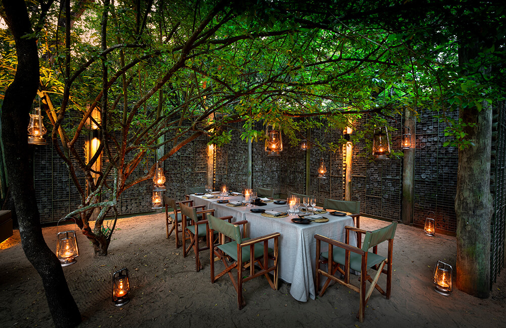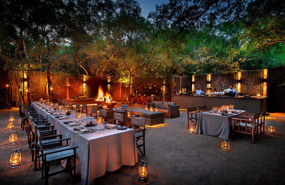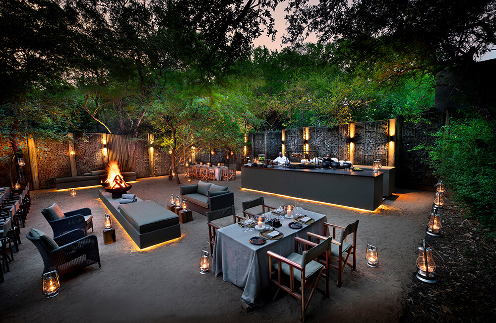 Pan-African al fresco dining under the stars, around a blazing fire in the lodge’s traditional African Boma.