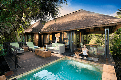 - Each exquisite suite features a private lap pool and viewing deck overlooking lush plains, where wildlife pass by.