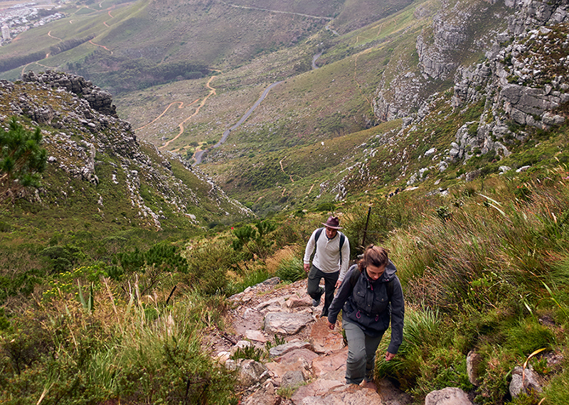 The initial path is intersected and a steep ascent up Platteklip Gorge starts where impressive sandstone cliffs set a dramatic scenery. There are minimal loose rocks, narrow ledges or exposure to heights, and no technical abilities required. The trail zigzags up the gorge which lessens the gradient through recurrent switchbacks. The Platteklip Gorge route finishes at the Table Mountain summit, just minutes from the upper cableway station where you will catch a cable car ride back down after soaking in the scenery. The route does not receive a lot of shade, which can make it a gruelling hike if you start too late in the hot summer months. During peak season it is also a very busy route, especially over weekends.