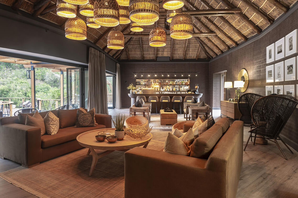 An exclusive 5-star safari lodge nestled amid lush vegetation and dramatic rocky cliffs.