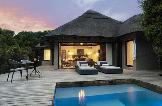 Eagles Crag at Shamwari Game Reserve is surrounded by magnificent mountain cliffs, boasts incredible panoramic views, and offers guests a luxurious stay in one of 9 exclusive suites. Shamwari Eagles Crag is a true haven of relaxation with a swimming pool, steam room, sauna, fitness and SPA facilities, downstairs lounge with billiard table, as well as a splendid upstairs lounge with a bar and fireplace opening onto a viewing deck and aerial pods. Exclusive packages at Shamwari’s Eagles Crag for groups and families can be arranged with private safari drives and exclusive accommodation.