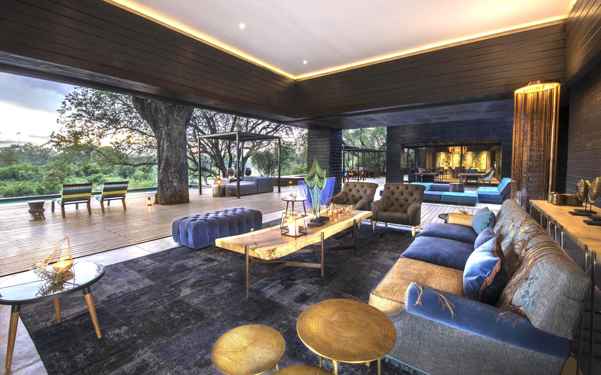 With an ancient Leadwood tree emerging through the deck, it's no secret where the 2-bedroom family suite finds its inspiration. Blues and grey tones with the introduction of delicate copper treasures Read morebring a homely warmth to the space. The Leadwood suite features two ensuite bedrooms separated by a private deck, lounge and plunge pool overlooking the reserve.Less