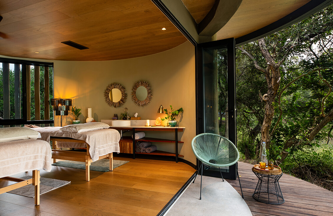 At the main camp you can expect exceptional dinning experiences under the star, gym and spa, rim flow pool and multiple relaxation areas overlooking the reserve. Nine hybrid canvas and glass suites provide a tranquil bushveld setting, complemented by secluded spaces like a hide, library, and open-air bar for both communal gatherings and moments of solitude. The camp’s interiors pay homage to South Africa’s Tsonga heritage, blending modern comforts with eco-friendly practices such as solar power and water conservation.