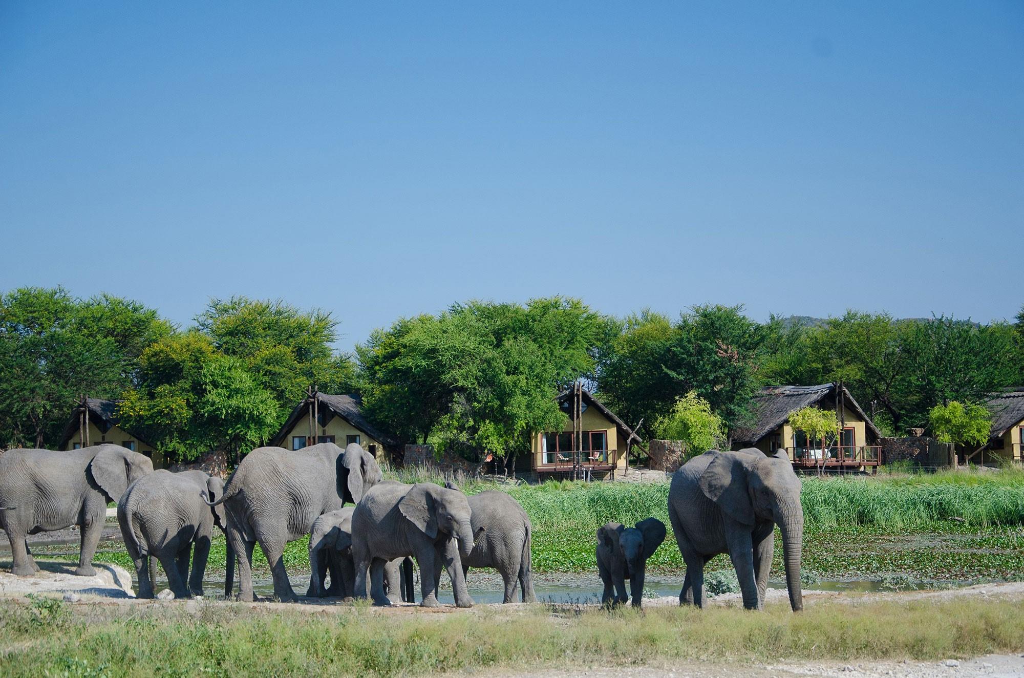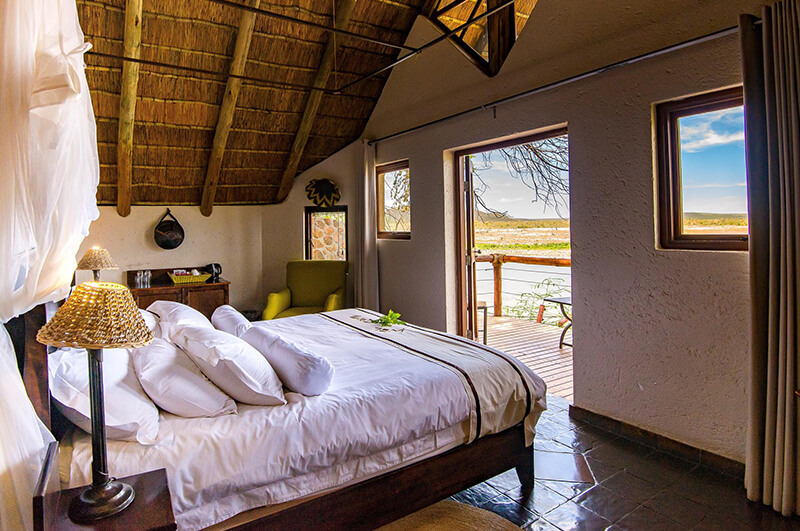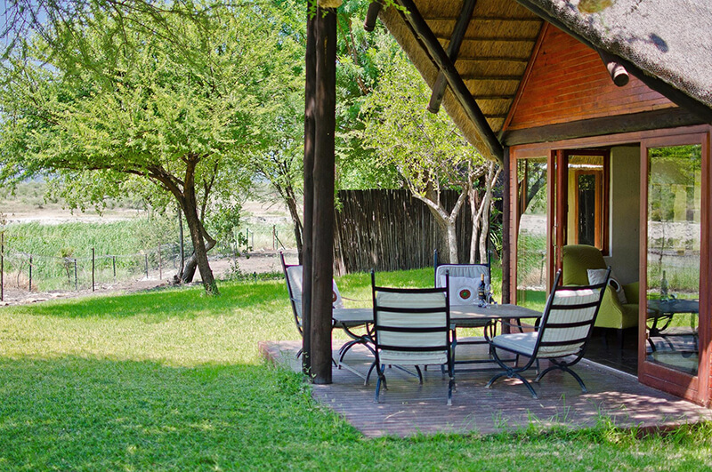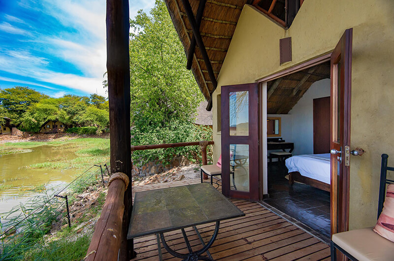 - The chalets are spread out on either side of the lodge, each featuring a viewing deck overlooking the waterhole.