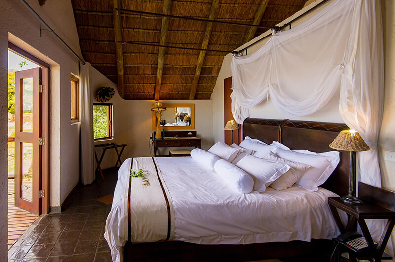 Each chalet boasts a private balcony overlooking a waterhole frequented by wildlife. You can also enjoy the waterhole view right from your elegantly draped bed. Read moreThe thatch ensuite units feature a luxurious oval bathtub and a large open-air shower. Less