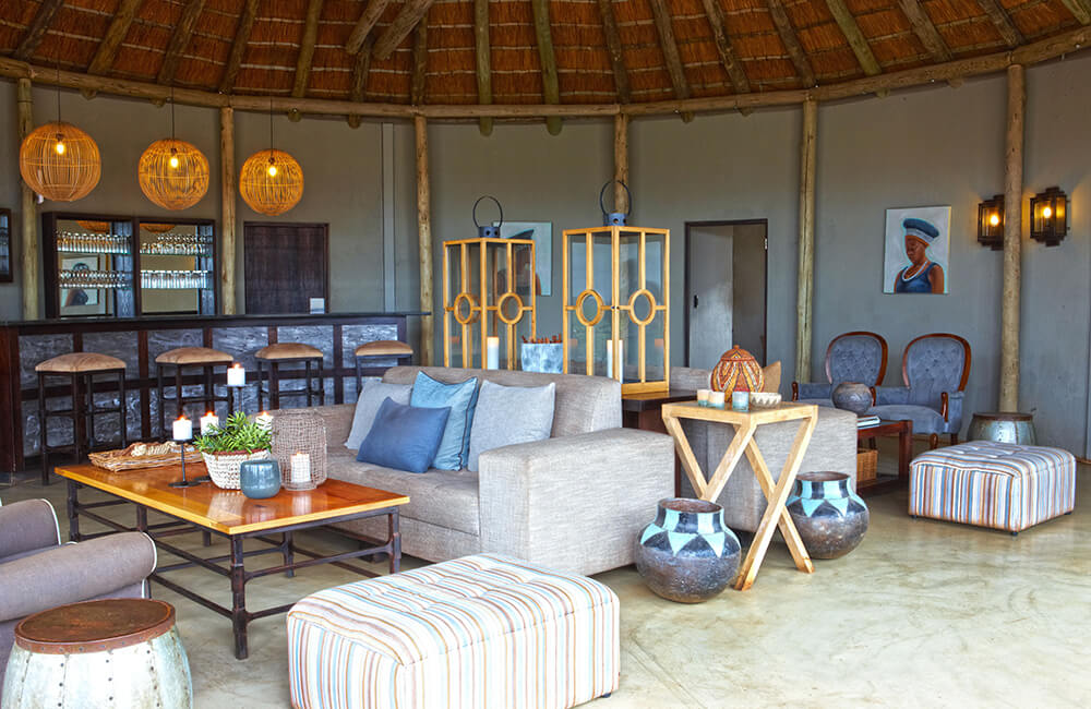- The main camp features a Hemingway-style lounge, dining areas, and a rim-flow pool with views over the reserve.