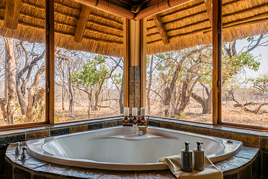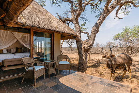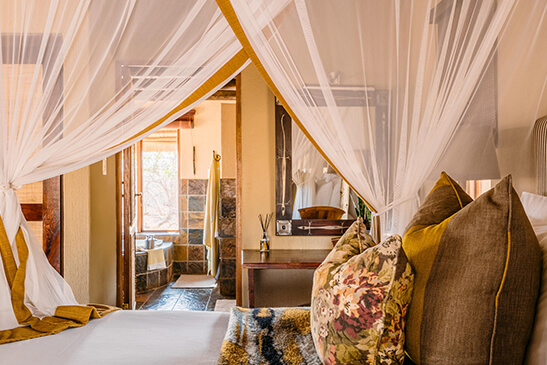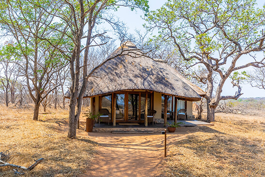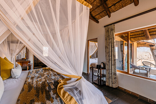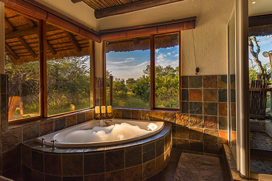 These enchanting thatch suites feature private viewing decks with bushveld views. Private outdoor showers make for a unique bathing experience and indoor bathrooms feature bush views through large windows while soaking in the bathtub. These spacious Read moreair-conditioned suites resemble comfort and warmth with classic decor. A minibar, coffee facilities, slippers, and toiletries are all little details contributing to a superior stay. Less