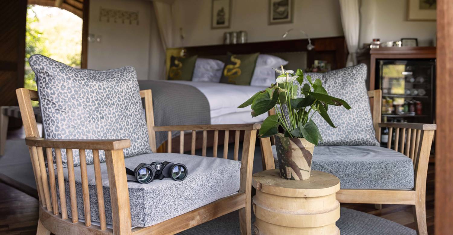 The luxurious Safari Suite near the Main Lodge features its own entrance with private boma fire pit, spacious lounge opening onto a large viewing deck with plunge pool, alfresco shower, and private dining table. The suite can be interconnected with the Safari Room to sleep 4 guests.